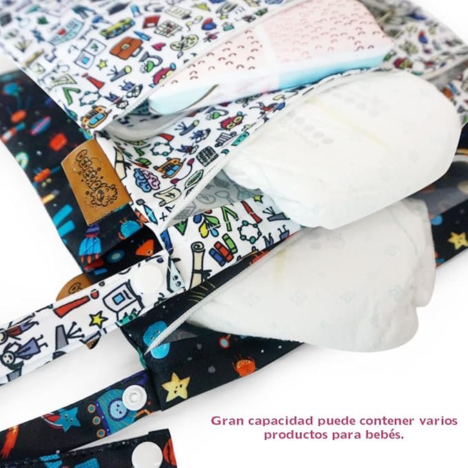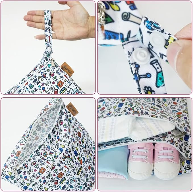 – Lavado: se recomienda lavar a mano y secar al aire para extender la vida útil de esta bolsa húmeda de pañales de tela.