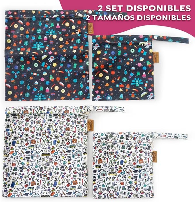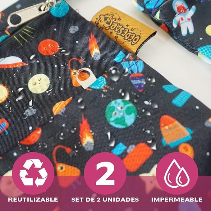 – 2 patrones, uno oscuro del espacio y otro claro pensado para llevar el almuerzo a la escuela o como bolsa muda bebe para guardería.