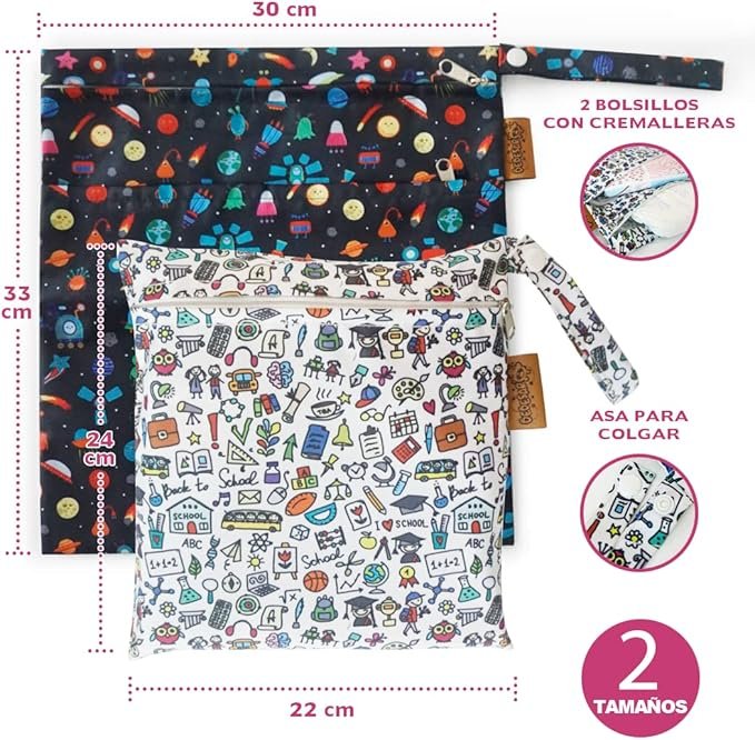 – Bolsillos dobles con cremallera, uno para artículos secos y limpios, otro para artículos húmedos o pañales sucios.